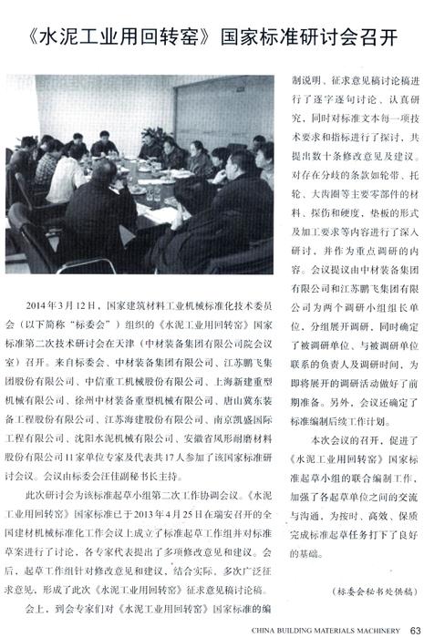 2014年3月12日,國(guó)家建筑材料工業(yè)機(jī)械標(biāo)準(zhǔn)化技術(shù)委員會(huì)組織的國(guó)家標(biāo)準(zhǔn)第二次技術(shù)研討會(huì)在天津召開(kāi)。江蘇鵬飛集團(tuán)股份有限公司等11家單位專家及代表共17人參加了該國(guó)家標(biāo)準(zhǔn)研討會(huì)議。