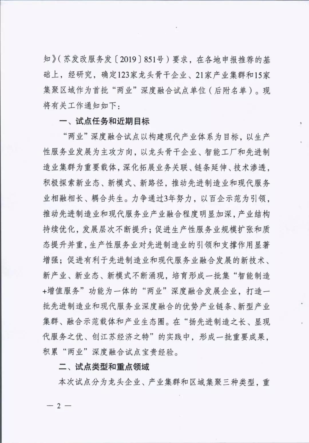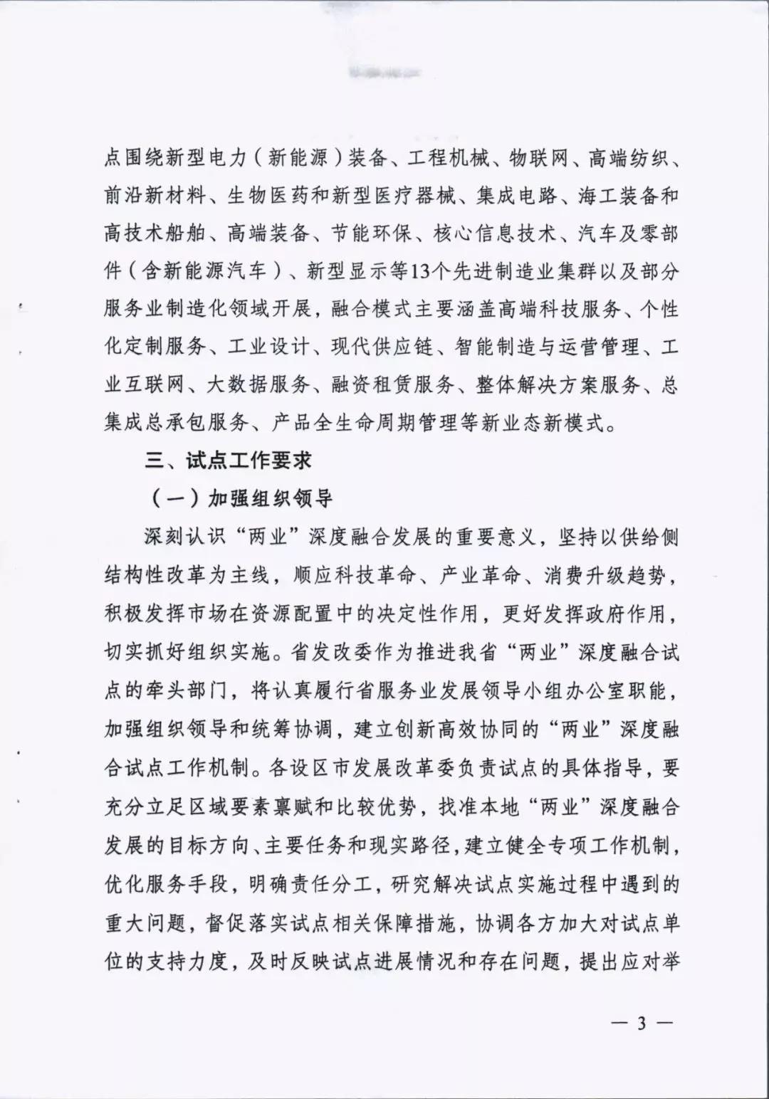 為貫徹落實中央深改委第十次會議精神、國家發(fā)改委等部門《關于推動先進制造業(yè)和現(xiàn)代服務業(yè)深度融合發(fā)展的實施意見》(發(fā)改產(chǎn)業(yè)〔2019〕1762號)和省委省政府部署要求,進一步推動先進制造業(yè)和現(xiàn)代服務業(yè)深度融合發(fā)展,我省啟動開展了江蘇省先進制造業(yè)和現(xiàn)代服務業(yè)深度融合試點推薦申報和遴選工作。根據(jù)《省發(fā)展改革委關于組織開展江蘇省先進制造業(yè)和現(xiàn)代服務業(yè)深度融合試點工作的通知》(蘇發(fā)改服務發(fā)〔2019〕851號)要求,在各地申報的基礎上研究確定123家龍頭骨干企業(yè)、21家產(chǎn)業(yè)集群和15家集聚區(qū)域作為首批“兩業(yè)”深度融合試點單位。我市江蘇鵬飛集團股份有限公司大型成套裝備總集成總承包融合試點、鑫緣繭絲綢集團股份有限公司繭絲綢全產(chǎn)業(yè)鏈產(chǎn)品生命周期管理融合試點、中國天楹股份有限公司智慧城市環(huán)境管理系統(tǒng)應用總集成總承包融合試點共三家企業(yè)入選試點名單。