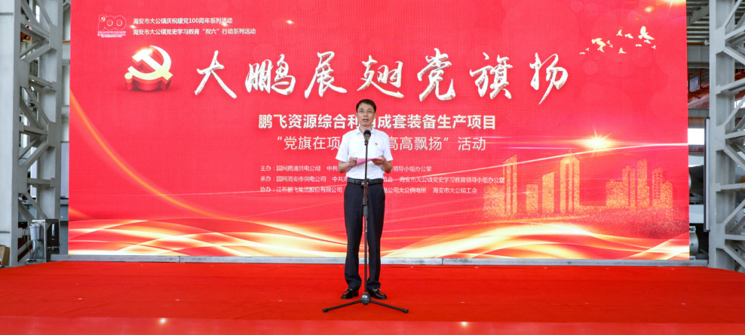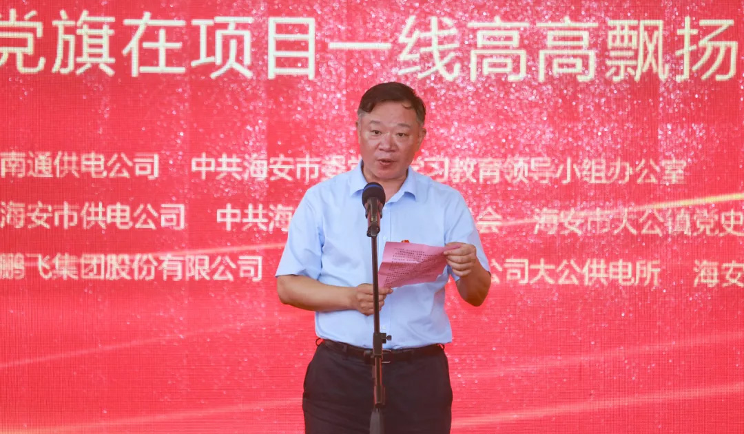 國網(wǎng)南通供電公司副總經(jīng)理李秋實,海安市委常委、宣傳部部長王榮貴,海安市委組織部副部長、“兩新”工委書記吳蘭,海安市委宣傳部常務(wù)副部長劉萬春,海安市委宣傳部副部長、新聞出版局局長陳琳,國網(wǎng)海安市供電公司總經(jīng)理唐玉婷,海安市發(fā)改委黨組成員、工信局專職副局長陳皞,鵬飛集團(tuán)黨委書記、董事長王家安,大公鎮(zhèn)黨委書記金山存,大公鎮(zhèn)黨委副書記、鎮(zhèn)長魯競共同啟動“黨旗在項目一線高高飄揚”活動。