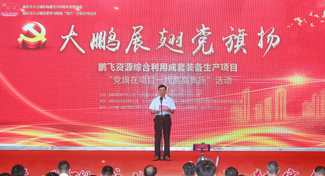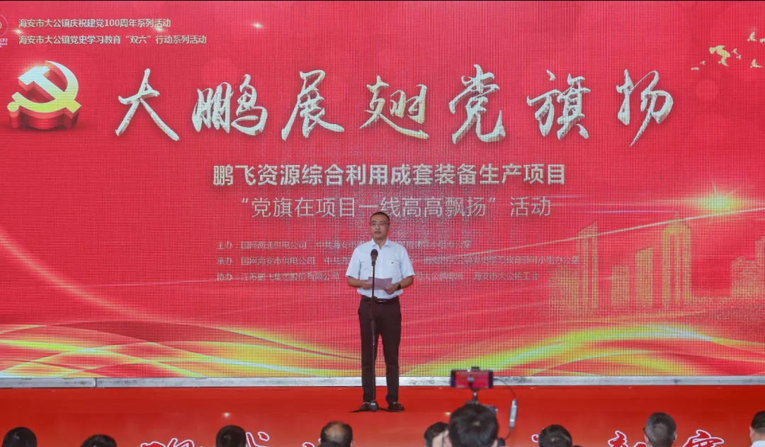 “將企業(yè)生產(chǎn)經(jīng)營與項目建設(shè)融入黨史學(xué)習(xí)教育,以黨建為引領(lǐng),讓支部建在項目上、黨旗飄在陣地上、黨員沖在火線上、關(guān)愛工人在心上,切實讓黨旗在項目一線高高飄揚……”6月16日下午,鵬飛資源綜合利用成套裝備生產(chǎn)項目“黨旗在項目一線高高飄揚”活動舉行,這也是海安市推動黨史學(xué)習(xí)教育“走深”“走心”“走實”,黨員干部在項目一線“建強(qiáng)組織筑堡壘、做優(yōu)服務(wù)強(qiáng)項目、為民辦事解難題”的真實寫照。