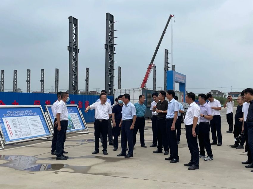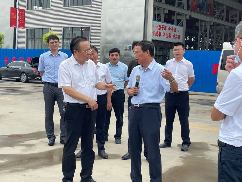 江蘇鵬飛集團(tuán)股份有限公司資源綜合利用成套裝備生產(chǎn)項目現(xiàn)場,黃衛(wèi)成聽取了公司董事長王家安關(guān)于資源綜合利用成套裝備生產(chǎn)項目的投資規(guī)模、用地面積、建筑面積、建設(shè)進(jìn)度等情況的介紹。此外,他還就項目建設(shè)的手續(xù)審批、大件產(chǎn)品的運(yùn)輸、疫情對公司產(chǎn)品出口造成的影響等問題與王家安進(jìn)行交流。