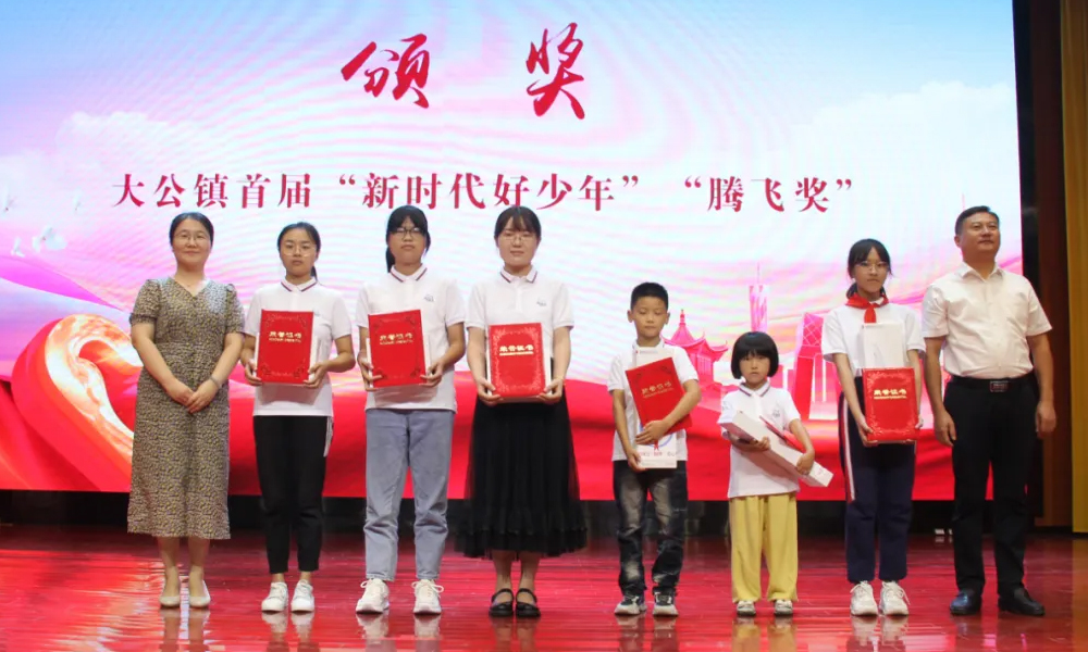 海安市委宣傳部未成年人思想道德建設(shè)科科長(zhǎng)奚海寧、大公鎮(zhèn)人大主席王軍共同為大公鎮(zhèn)首屆“新時(shí)代好少年”“騰飛獎(jiǎng)”獲得者頒獎(jiǎng),并送上禮品。