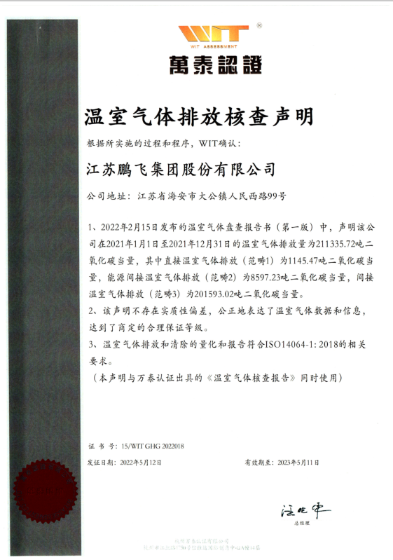 江蘇鵬飛集團股份有限公司一直以來堅持綠色采購,綠色生產,綠色物流的原則,積極響應并參與相關方(政府、客戶等)節(jié)能降排、碳排放報告活動。