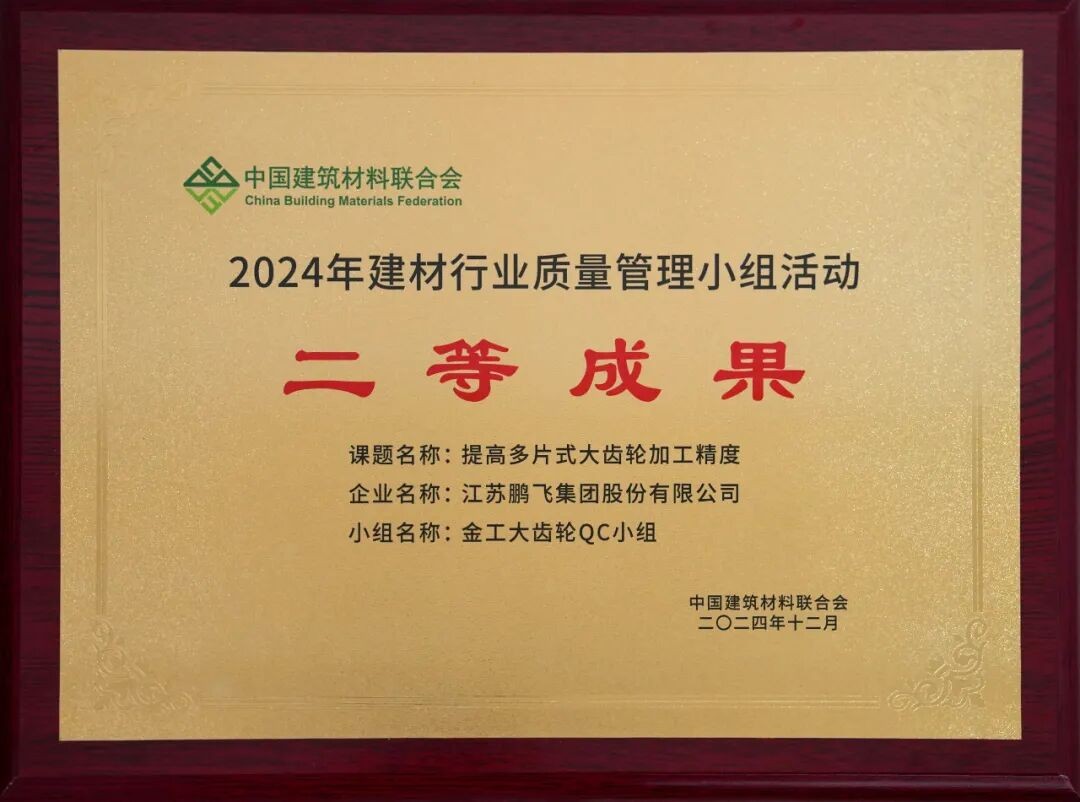 鵬飛金工大齒輪QC小組的課題“提高多片式大齒輪加工精度”榮獲2024年建材行業(yè)質(zhì)量管理小組活動(dòng)二等成果。