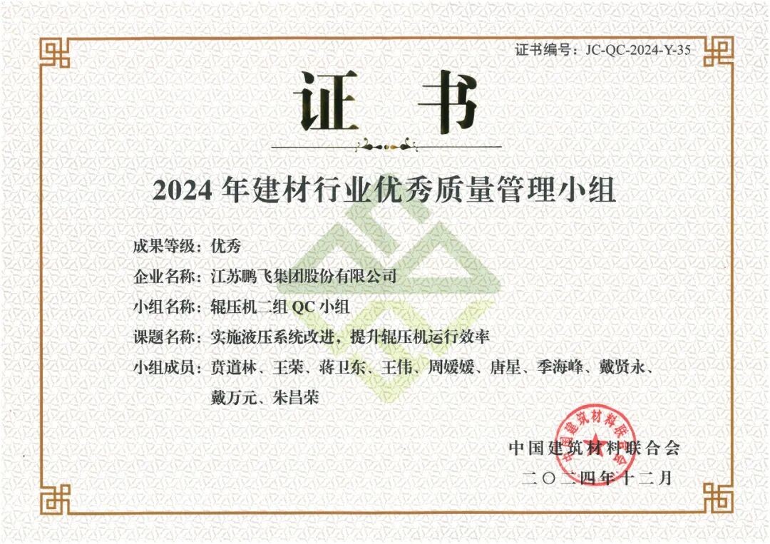 鵬飛輥壓機(jī)二組QC小組的課題“實(shí)施液壓系統(tǒng)改進(jìn),提升輥壓機(jī)運(yùn)行效率”榮獲2024年建材行業(yè)優(yōu)秀質(zhì)量管理小組優(yōu)秀成果,輥壓機(jī)二組QC小組榮獲“我最喜愛(ài)的質(zhì)量管理小組”。