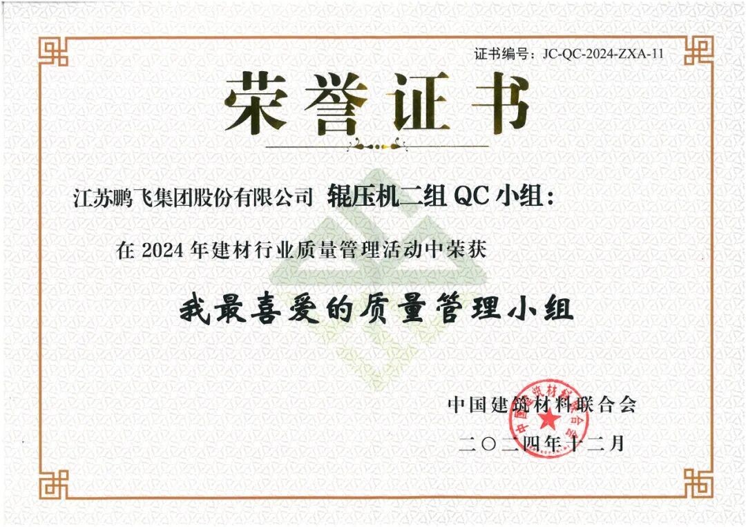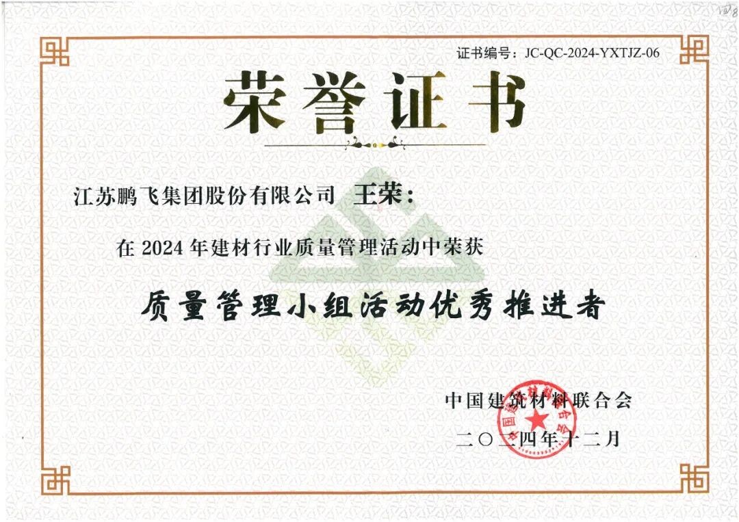 會(huì)議為2024年建材行業(yè)質(zhì)量管理活動(dòng)優(yōu)秀質(zhì)量管理成果、先進(jìn)個(gè)人和優(yōu)秀組織,2024年建材行業(yè)質(zhì)量管理活動(dòng)“我最喜愛(ài)的質(zhì)量管理小組”和“我最喜愛(ài)的質(zhì)量信得過(guò)班組”,以及2024年度建材行業(yè)“三品”典型案例的獲得者頒發(fā)證書(shū)。鵬飛多項(xiàng)成果榮獲佳績(jī)。