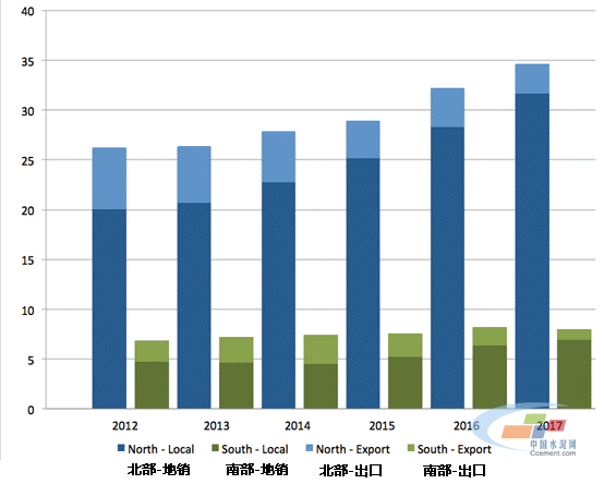 上圖展現(xiàn)了巴基斯坦國內(nèi)水泥行業(yè)的現(xiàn)狀,巴基斯坦的年度水泥消費(fèi)量從2012年的3310萬噸增長到了2017年的4280萬噸,增長幅度在30%左右,其中五分之四的水泥消費(fèi)集中在巴基斯坦的北部地區(qū)。與此同時(shí),更重要的是,巴基斯坦的出口水泥從2013年的830萬噸降低到了2017年的420萬噸。造成這一現(xiàn)象的主要原因是阿富汗市場的下跌,以及水性熟料出口量的減少。考慮到南方市場的出口水泥比例較高,盡管水泥總消費(fèi)量在增長,但是出口量的減少對(duì)南方可能會(huì)造成更大的打擊。2018年到目前為止,類似的趨勢依然存在,唯一有所改變的是南方熟料出口量的在今年有反彈的跡象。