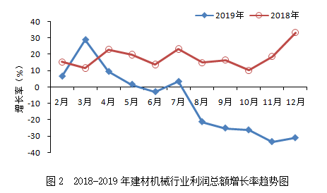 2019年,建材機械行業(yè)累計實現(xiàn)利潤總額36.57億元,同比下降31.00%,增速較上年同期回落64.26個百分點,落后于建材工業(yè)(15.6%)、機械工業(yè)(-4.53%)的增速,遠低于建材機械相關領域工程機械(16.48%)、重型礦山機械(21.65%)增速。從增速變化趨勢看(見圖2),全年利潤總額增速下行態(tài)勢明顯,且與上年相比回落較大,降幅最高達64.26個百分點。