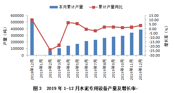從行業(yè)重點監(jiān)測的產(chǎn)品看,水泥專用設備產(chǎn)量實現(xiàn)小幅增長,2019年累計完成38.65萬噸,同比增長3.69%,較上年同期下降6.37個百分點。從全年產(chǎn)量增速變化趨勢看(見圖3),上半年波動較大,下半年逐步趨緩、趨穩(wěn)。