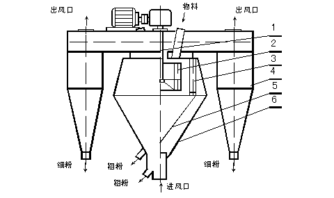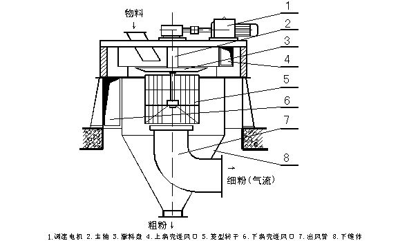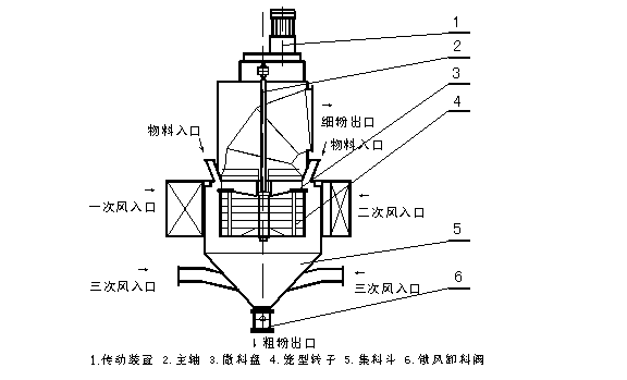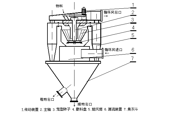 由傳動裝置、回轉(zhuǎn)部分(主軸、撒料盤、轉(zhuǎn)子等),機殼(內(nèi)筒、導(dǎo)向葉片、內(nèi)錐體、外筒、外錐體、進風口、加料口、兩個粗粉出口等),細粉收集裝置(四個旋風筒等)組成。