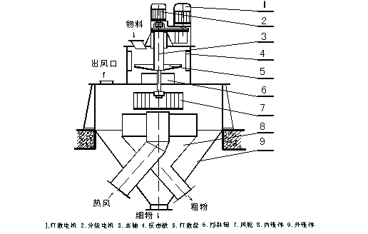 2.打散裝置與分級裝置采用兩臺電機分別驅(qū)動,既滿足提高打散能力的需要,又可以調(diào)節(jié)、控制產(chǎn)品細度;