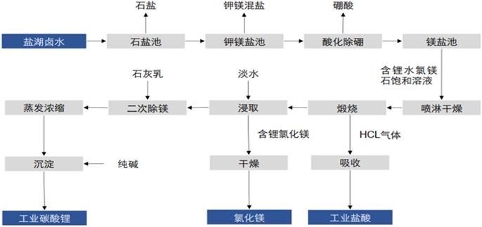 (五)煅燒法 煅燒浸取法的部分主要流程與大部分礦石的冶煉方法類似,先將鹵水脫硼,蒸發(fā)濃縮得到水氯鎂石和氯化鋰的固體混合物,再進行高溫煅燒(450-900℃)、水浸分離氧化鎂、純堿沉淀分離獲得碳酸鋰。