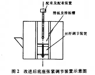 原來設(shè)計的配重裝置采用兩邊齒條,通過配重和下滾筒的自重進行皮帶張緊,兩邊調(diào)節(jié)裝置同時調(diào)節(jié)皮帶的跑偏情況。從理論上講沒有問題,但實際使用中皮帶兩邊跑偏嚴(yán)重,無法進行調(diào)整,增大配重或偏向提升或下沉齒條都無法解決問題。經(jīng)研究分析,我們將配重連接M32的絲桿,在導(dǎo)向板的下半部分設(shè)置調(diào)節(jié)裝置,解決了問題。改進前后見圖1、圖2。