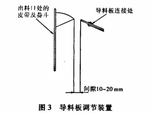 由圖3可見,間隙應(yīng)調(diào)整在10-20mm,不能太大,也不能太小。間隙太小,機組運行時,畚斗與導(dǎo)料板相碰,無法運行。間隙太大,則回料太多,導(dǎo)致機組箱體內(nèi)堵料而停車。導(dǎo)料板系易損件,平時應(yīng)經(jīng)常檢查導(dǎo)料板的磨損情況,做到及時更換,并保證安裝牢固。