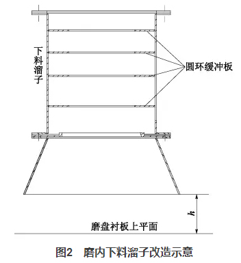 一方面它降低了入磨物料高落差對(duì)溜子的沖刷,另一方面圓環(huán)的收口作用使得物料的下料點(diǎn)發(fā)生了變化,將原先的單點(diǎn)偏心下料改成接近中心下料,改善了物料在磨盤(pán)上的偏離現(xiàn)象。同時(shí),適當(dāng)調(diào)整h值的大?。ㄔO(shè)計(jì)600mm,最終改為400mm),使得下料波動(dòng)時(shí),可以起到一定的緩沖作用,穩(wěn)定料床。
