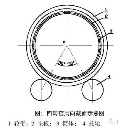 我公司生產(chǎn)的回轉窯采用浮動輪帶支撐窯筒體,輪帶是實心矩形斷面活套套在筒體上,加固窯筒體,見圖1。輪帶與筒體之間均勻分布著32塊墊板,避免輪帶內(nèi)表面與筒體外表面直接接觸。圖2為浮動輪帶與墊板結構示意圖。表1為Ⅲ檔原墊板 的主要尺寸及塊數(shù)。在回轉窯運轉過程中,筒體、輪帶和墊板之間留有一定的間隙。表2為輪帶內(nèi)徑與墊板外徑之間的間隙,這樣必然引起輪帶與筒體墊板之間產(chǎn)生滾動和滑移。我公司生產(chǎn)的回轉窯已運轉僅年,墊板與輪帶內(nèi)圈均有不同程度的磨損,使輪帶起不到加固筒體作用,造成筒體橫截面變形增大,同時輪帶和墊板之間產(chǎn)生很大滑移,已超過極限值,致使限制輪帶軸向竄動的壓條頻繁被推掉。