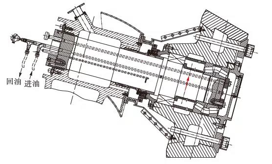 磨輥軸承潤滑是通過集中潤滑系統(tǒng)來實現(xiàn)的,通過稀油站向磨輥內(nèi)部供油,油品為460#極壓工業(yè)齒輪油。磨輥裝置結(jié)構(gòu)及潤滑油走向如圖1所示。