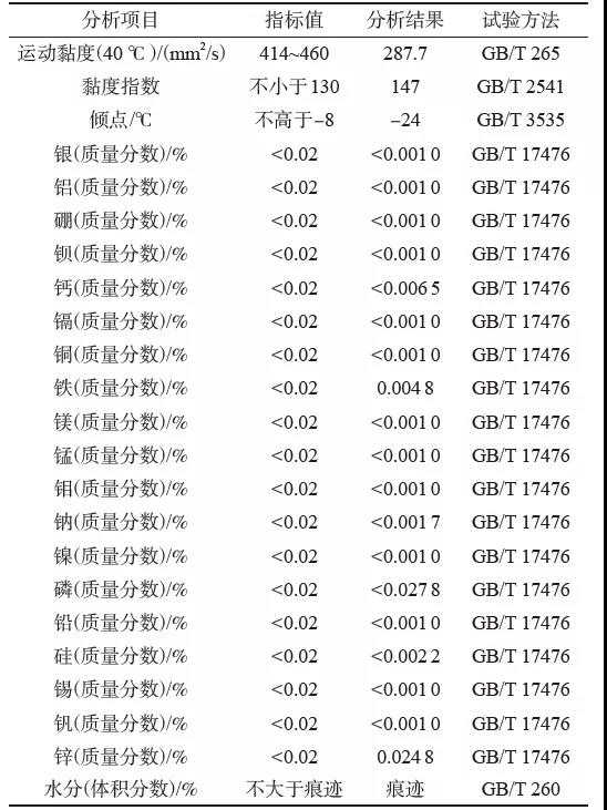 現(xiàn)場檢查發(fā)現(xiàn),磨輥腔體內(nèi)部油品發(fā)黑、油品黏度較低,現(xiàn)場對油品取樣進行分析,結(jié)果如表1所示。由表1可以看出,該牌號油品40 ℃正常的運動黏度應該在460 mm2/s,實測值為287.7 mm2/s,水分超標,潤滑油本身碳化嚴重,品質(zhì)下降,鐵與鋅雜質(zhì)含量增加。從分析結(jié)果判斷,該型立磨使用的油品已不滿足磨輥軸承正常運行所需要的油品條件。