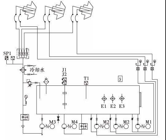 立磨潤滑系統(tǒng)原理如圖2所示,磨輥潤滑系統(tǒng)工作原理為:潤滑系統(tǒng)工作時,油液經(jīng)供油泵從油箱抽出,經(jīng)過濾器、冷卻器、分流器等進入磨輥內(nèi)部,經(jīng)循環(huán)潤滑換熱后,由回油泵從磨內(nèi)強制抽出,送回油箱,潤滑系統(tǒng)通過循環(huán)往復實現(xiàn)磨輥的潤滑功能。單個磨輥供油泵分配流量為13 L/min,單輥配置一個能力為20 L/min的回油泵強制回油。
