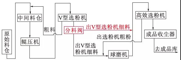 圖3 兩路分料閥3 試驗(yàn)步驟(1)在設(shè)備運(yùn)行穩(wěn)定、產(chǎn)質(zhì)量正常情況下,出V型選粉機(jī)微粉全部入磨機(jī),即以聯(lián)合粉磨方式為基準(zhǔn),簡(jiǎn)稱為試驗(yàn)1;