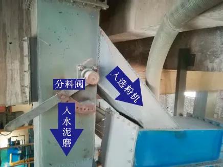 2 粉磨流程改進(jìn)我們?cè)诔鯲型選粉機(jī)與入磨溜子之間安裝可調(diào)節(jié)翻板式分料閥(以下簡(jiǎn)稱分料閥),該分料閥可將物料分為兩路,一路入磨機(jī),另一路經(jīng)空氣輸送斜槽入高效選粉機(jī),同時(shí),該分料閥還可進(jìn)行10格調(diào)節(jié)(0%~100%)。試驗(yàn)前后工藝流程簡(jiǎn)圖及照片分別見圖1~圖3。
