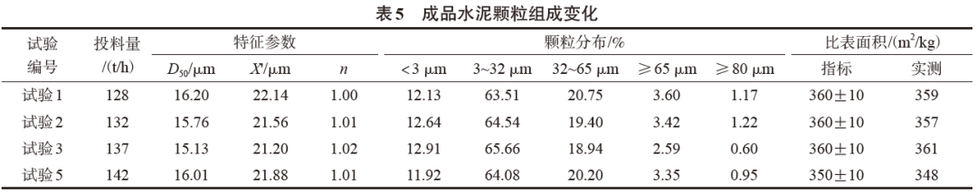 關(guān)閉和開啟不同格數(shù)的分料閥進(jìn)行生產(chǎn),分別標(biāo)定磨機(jī)產(chǎn)量,并對(duì)粉磨過程中各點(diǎn)物料進(jìn)行取樣,測(cè)定物料顆粒組成及物理性能、與外加劑相容性。然后對(duì)加工過程中各點(diǎn)物料粒度變化情況進(jìn)行比較后進(jìn)行質(zhì)量指標(biāo)的調(diào)整(試驗(yàn)5)。