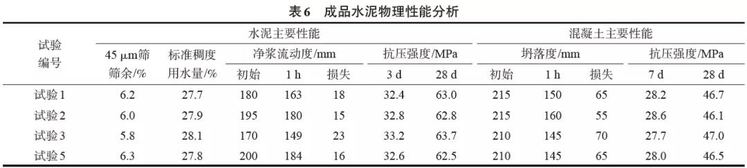 由表5和表6可以看出,成品水泥隨著產(chǎn)量的增加,相對(duì)基準(zhǔn)試驗(yàn)1,試驗(yàn)2和試驗(yàn)3中<3 μm和3~32 μm顆粒含量增加,≥32 μm顆粒含量減少,特征粒徑X'和中位徑D50變小,均勻性系數(shù)n增大,顆粒分布更為集中;在比表面積基本相同情況下,成品水泥的凈漿經(jīng)時(shí)損失和混凝土坍落度損失增大,說明成品水泥與外加劑的相容性變差,但水泥和混凝土的抗壓強(qiáng)度有所提高。