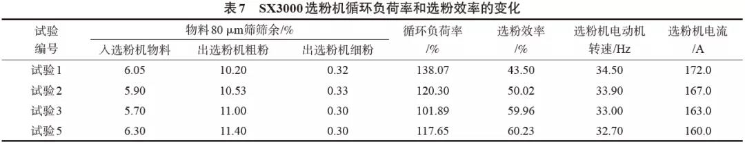 SX3000型選粉機(jī)系統(tǒng)循環(huán)負(fù)荷率和選粉效率對(duì)比見表7。