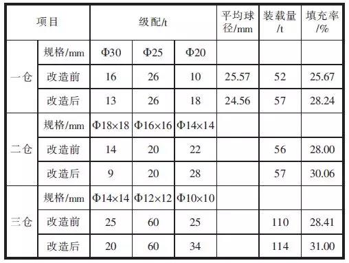 表2 改造前后磨內(nèi)研磨體級(jí)配情況