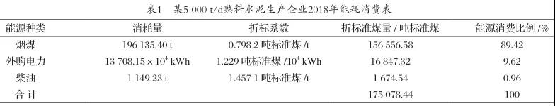 某水泥企業(yè),現(xiàn)有1條5000t/d新型干法水泥回轉(zhuǎn)窯生產(chǎn)線以及2臺180t/h水泥磨,具有年產(chǎn)普通硅酸鹽水泥熟料150萬t和年產(chǎn)硅酸鹽水泥160萬t的生產(chǎn)能力。主要產(chǎn)品為PO42.5和PS32.5A水泥。主要消耗的能源為煙煤、電力、柴油等。主要生產(chǎn)工序包括石灰石礦山開采、生料制備、熟料煅燒、水泥制成。2018年該企業(yè)綜合能耗為175078.44噸標準煤。主要能源消費情況如表1所示。