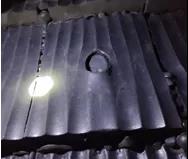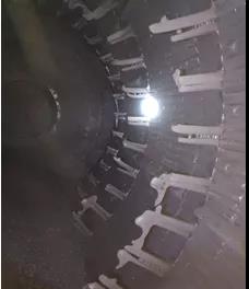原出料篦板為篩板外加鑄件邊框的防堵型篦板,篦縫為 5~ 8 mm,此種篦板雖有防堵效果,但磨尾的粗顆粒物料與鋼段會從篦板之間的縫隙中進入到選粉機,再進入磨機一倉。