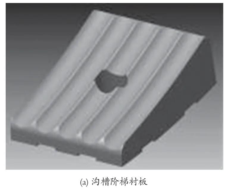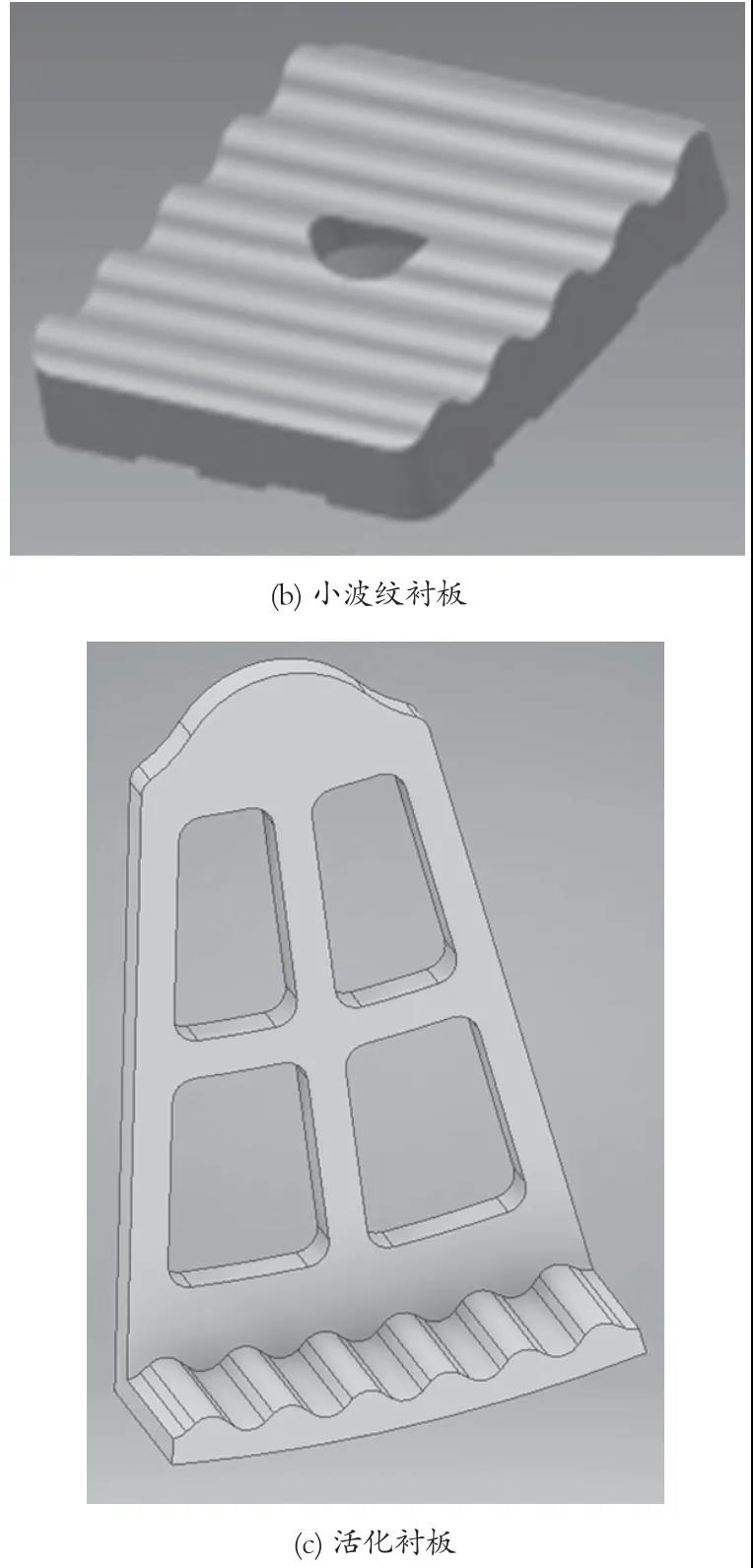 優(yōu)化前筒體襯板如圖 1 所示。一倉采用溝槽階梯襯板,其有效長度為 3.15 m,溝槽階梯襯板有磨損,階梯的高度差和溝槽可進一步優(yōu)化;二倉采用小波紋襯板+4 圈活化襯板,小波紋襯板厚度為 75 mm,降低了有效內(nèi)徑,增加了電耗,活化襯板磨損嚴重,排列方式可進一步優(yōu)化。