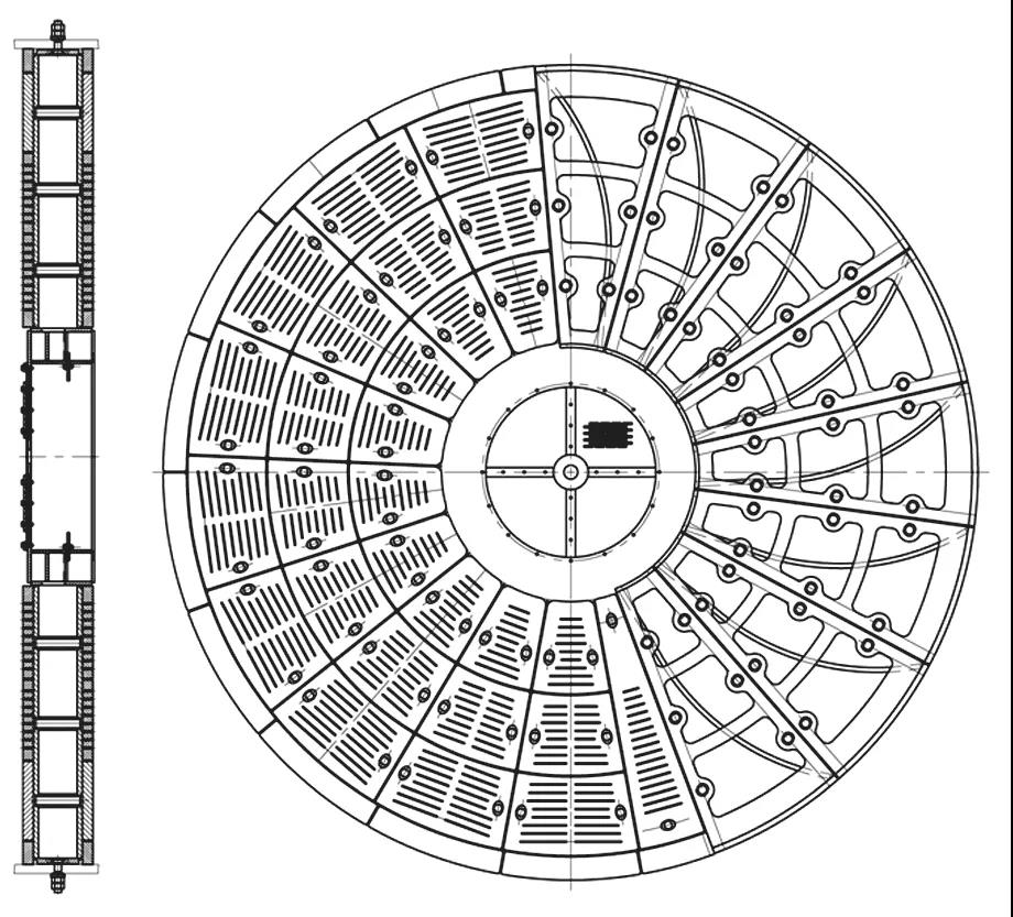 結(jié)構(gòu)方面,在考慮研磨體填充率與料面的情況下,盡可能增大中心圓的直徑,隔倉兩側(cè)采用篦板,篦縫寬度為 6 mm,通孔率為 7.8%,兩側(cè)篦板的通孔率保持一致,可改善隔倉截面通風,降低通風阻力和中心圓處風速。物料流動方向安裝有閘板,現(xiàn)場可根據(jù)粉磨工藝及物料特性等來控制物料的流速,從而提高產(chǎn)品的質(zhì)量和產(chǎn)量。