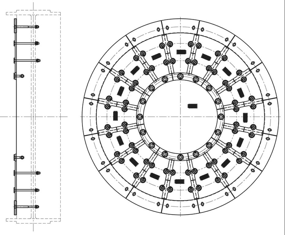 優(yōu)化后的筒體襯板如圖 2 所示。一倉仍采用溝槽階梯襯板,階梯的高度差決定了襯板的提升能力,溝槽的波紋兼顧研磨作用。優(yōu)化后襯板的階梯高度差為100 mm,溝槽的半徑為 R20 mm,深度為 10 mm,提高了襯板的提升和研磨效率,可更好地發(fā)揮一倉以細碎為主、研磨為輔的作用。二倉為小波紋襯板+5 圈活化襯板。小波紋襯板的波紋重新設(shè)計,波峰波谷高度差為 15 mm,盡可能地增大研磨面積,以提高二倉的研磨效率,增強研磨能力??紤]研磨體填充率為30%,活化襯板高度為 750 mm,環(huán)數(shù)增加至 5 圈,重新排列活化襯板的安裝位置 (見圖 3),每一圈的活化襯板交錯排列,可更好地發(fā)揮研磨體的粉磨能力,最大程度消除研磨死區(qū);合理設(shè)計活化襯板的過料面積,將靠近筒體外圓高度為 150 mm的部分設(shè)計成盲板,可有效控制物料在磨內(nèi)的研磨時間,提高磨機研磨效率和物料的磨細程度,降低循環(huán)負荷,從而提高產(chǎn)量、降低電耗。