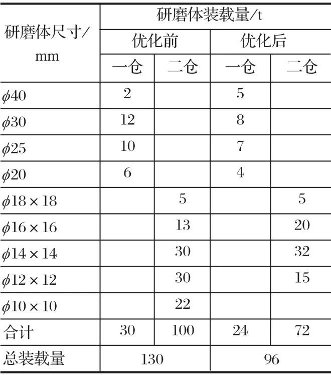 由于對磨內(nèi)襯板、隔倉裝置和出料篦板進行了優(yōu)化,使得研磨效率提高,因而可適當減少研磨體填充量,將一倉和二倉的填充率由 28% 降至 22%,降低了磨機負荷,進而降低了電耗。優(yōu)化前后研磨體級配如表 1 所列。